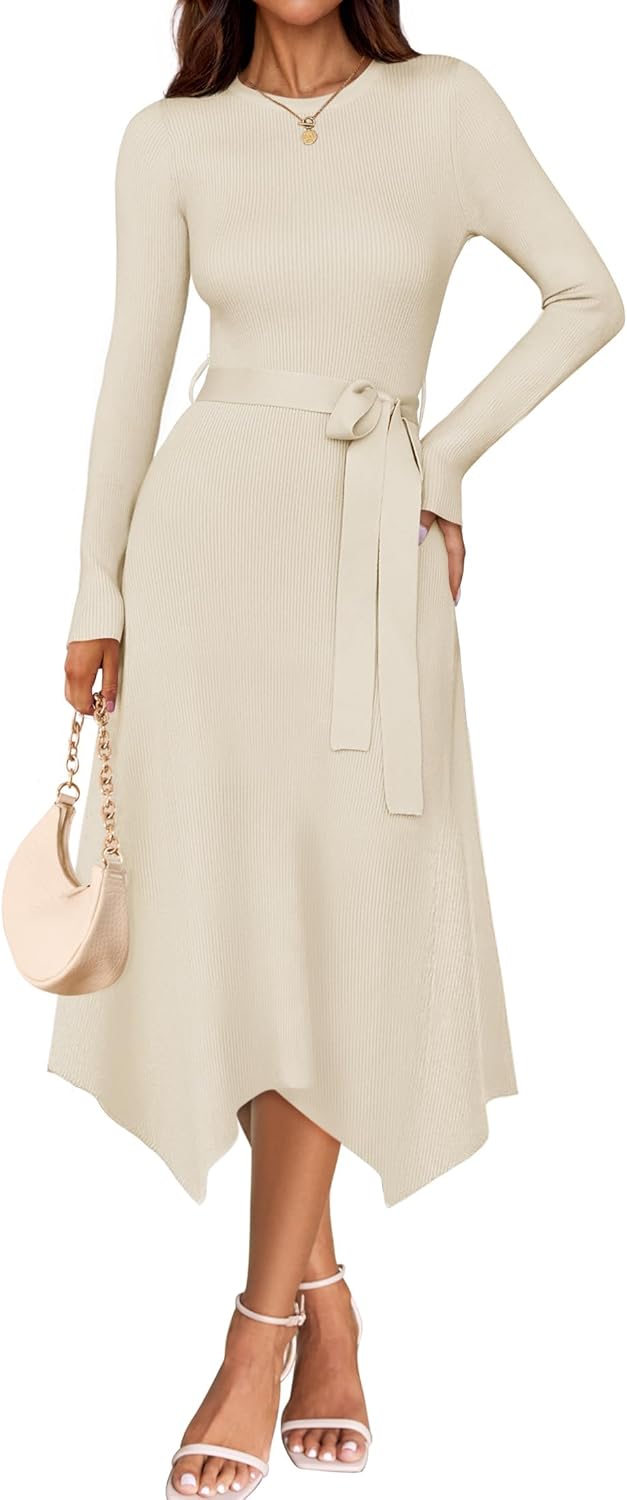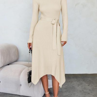 - Our exquisite women’s knit dress, a must-have addition to your wardrobe. This crew neck, long sleeve dress is designed with its A-line silhouette, self-tie waist, and midi length. The irregular hem adds a touch of uniqueness, making it stand out from the crowd.