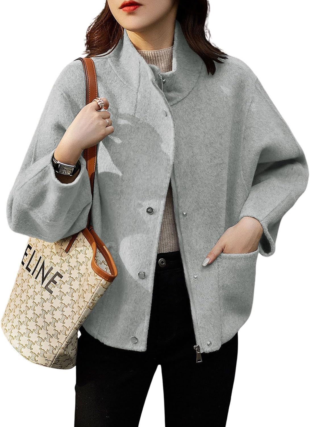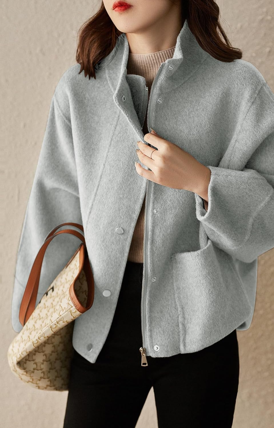 • Fashion stand collar wool coat women, featuring cool standing collar design, made of high quality wool blend fabric, can be dressed up and down, a must-have in women’s wardrobe.