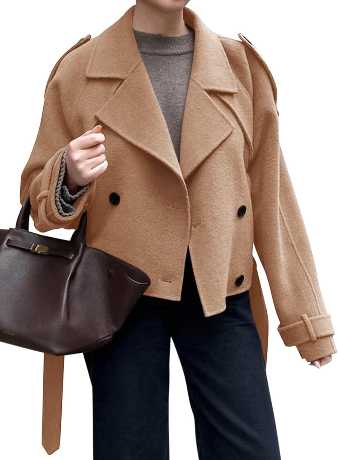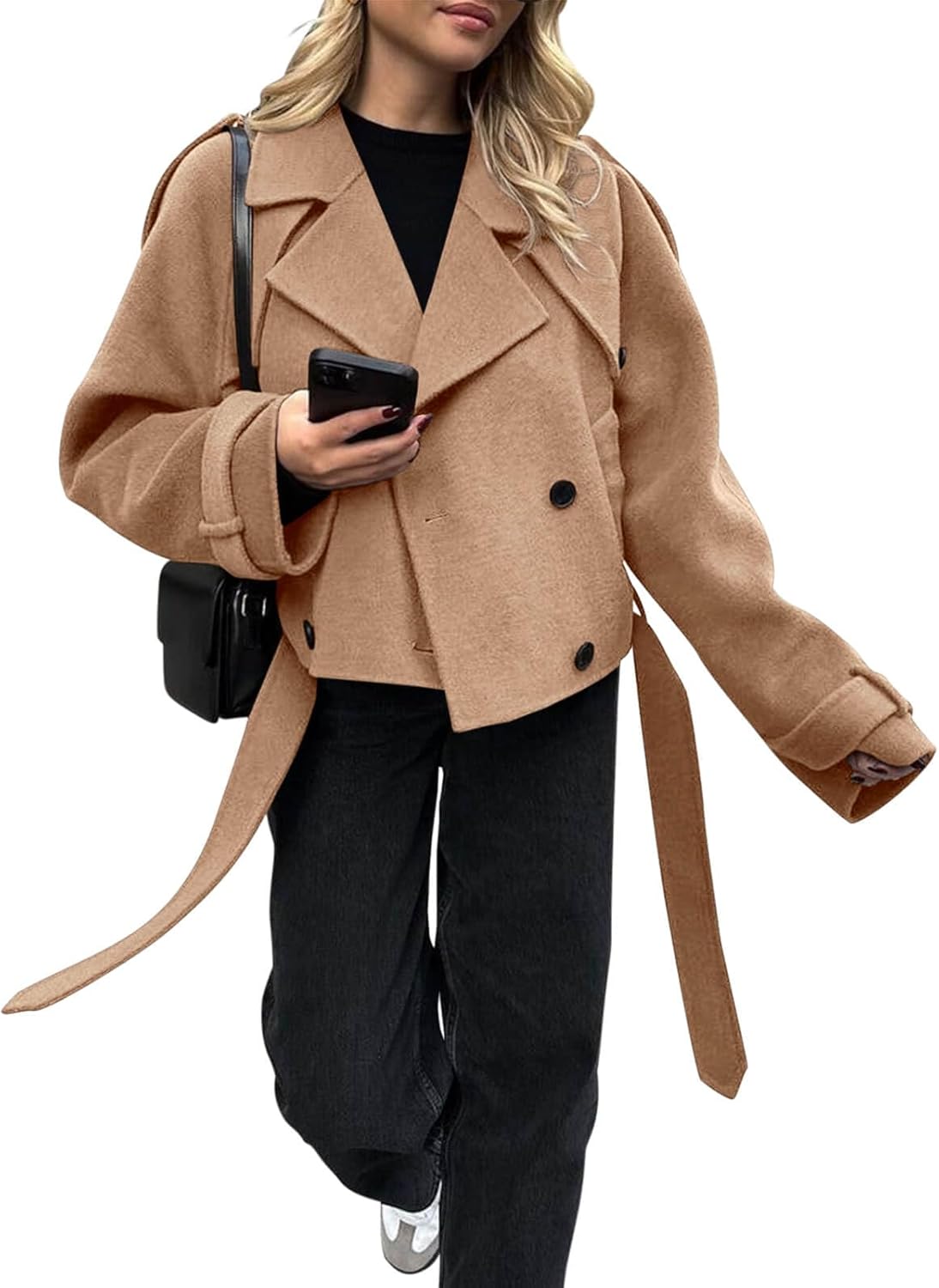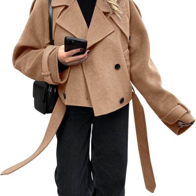 - Features: Cropped pea coat with belt features long sleeve, notched lapel, double breasted, two side pockets, basic solid color, loost fit style, perfect choice for you in chilly days.