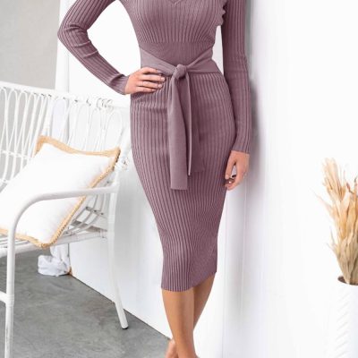 • Features: classic solid color, bodycon and slim fit, tie waist with a belt, sexy v neck, ribbed long sleeves, elegant midi knitted sweater dress. Stretchy and flexible, soft and comfortable to wear.