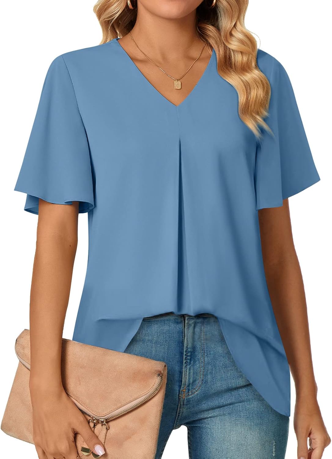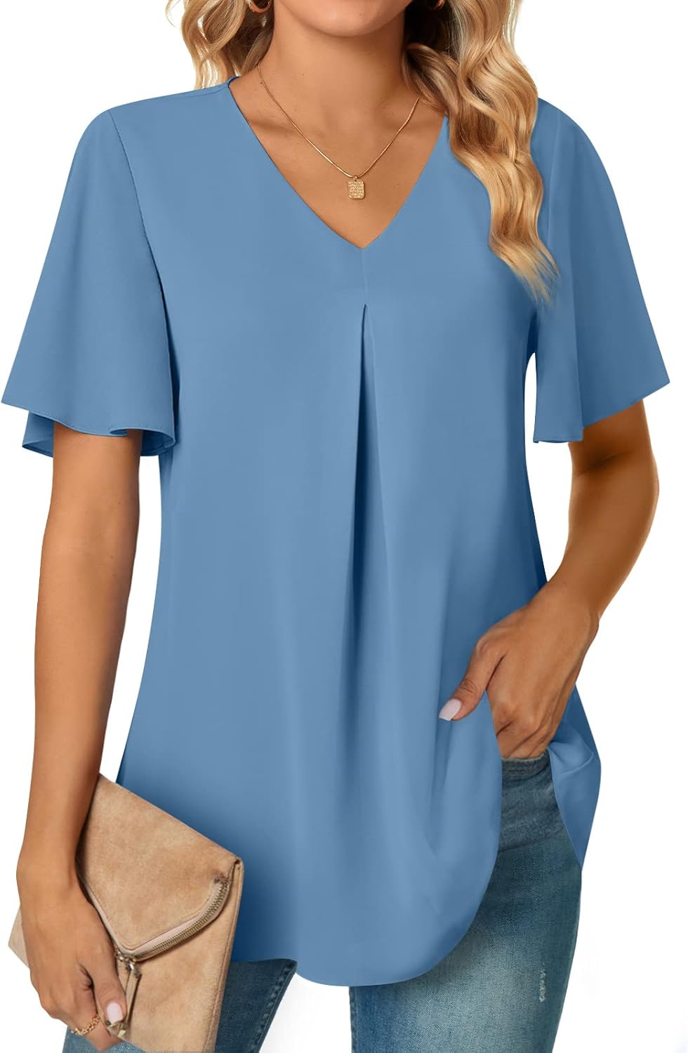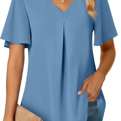 - Chic Design: Casual style T-shirts, loose fit blouse, v neck tops tee, pleated both front and back. The flutter short sleeves not only make you feel cool but also hide the upper arms in a flattering way and create a slimming look.