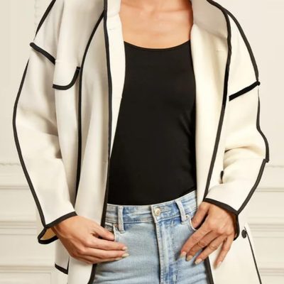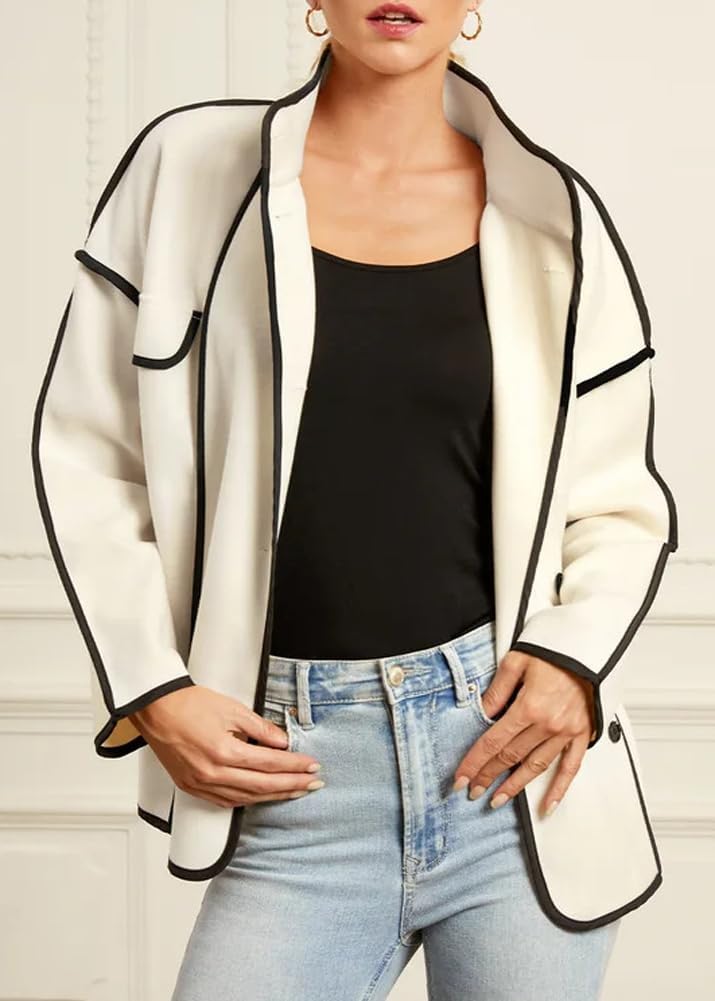 - Chic and cute wool coat for women, featuring contrast color piping design, front single breasted button down placket, basic stand collar, also can be worn as turn down collar, v-neck, long sleeve with drop shoulder, hip length.